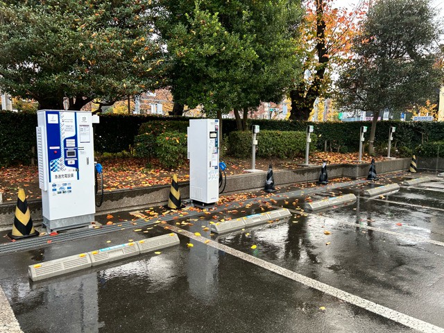 東光高岳製50kw急速充電器とニチコン製25kw急速充電器が駐車場南東、大学通り側に設置されていました。最近、設置ばかりのようでケーブルも充電器も新品のようでした。e-Mobility Power系カードまた、エコQ電認証から利用でき、エコQ電の場合は23.1円/分からとてもリーズナブルな価格設定です。また、急速充電器の隣にはTerra Charge認証Panasonic製3kwの普通充電器(コンセント)が4台設置されていました。こちらも現在利用できるようです。なお、EV車優先の駐車枠ですが、駐車枠にEVと記載されているのではなく車止めに記載されており、駐車時には気づかない可能性があるのでわかりやすい表示をお願いしたいです。