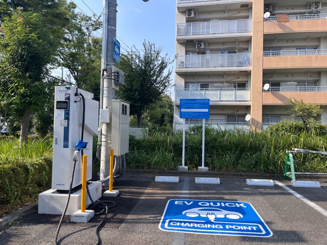 ニチコン製50kW器です。けやき通りから都営アパートへ左折入場するとすぐ左手に設置されてます。