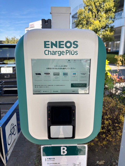 東光高岳製50kw機が道路寄りの場所に設置されていました。 empカード利用できます。ビジターの場合は、イーモビリティパワーアプリから1分55円で利用できます。(クレジットカードのみでの支払いです)