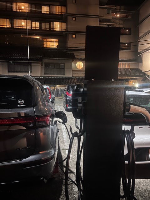 宿泊したので使えましたけど 普通にホテル宿泊者の駐車場として使われてますので、チェックイン時に場所が空いてたら使える感じです。 EV用に空けておくのはほぼ無いと思います。順番につめていく感じです。 チェックイン時に充電したいと言ったらはぁみたいな顔されましたので。 偶々、1台分の場所が空いてたので良かったですが。もう一台はベンツの方が充電してました。 充電必須の方は、ホテルへ予約が良い感じです。 充電器はホテルの前の道挟んだ向かえの駐車場で奥の橋側から4台分です。