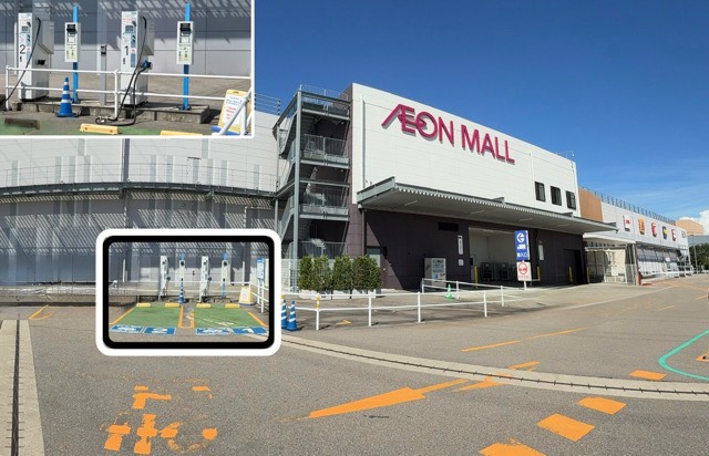 西館の南側の「AEON MALL」と大きく書かれている部分の左側、建物近くにあります。写真編集 イオンモール高岡(1)のうち2台の急速の充電器はアプリ上での充電スポットの位置とは違う「西館」のところにあります。初見では見つけられなく、他のアプリを使って見つけました。ぜひこちらのアプリでも2台は独立した充電スポットとして欲しいと思います。
