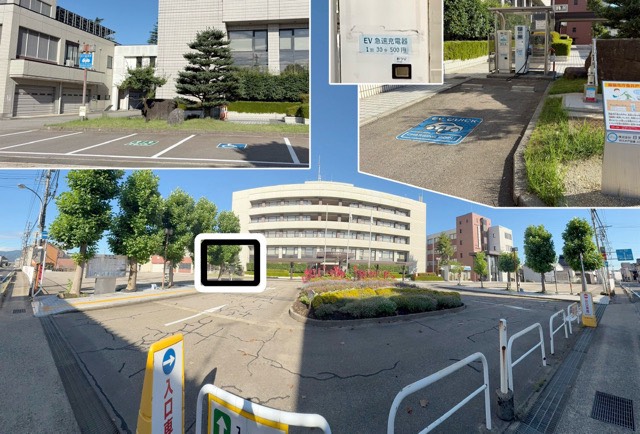駐車場にあります。 南砺市は現金支払い形式の充電器が多いのですが、 岐阜に向かうため充電しておきたいのに不便に思います。