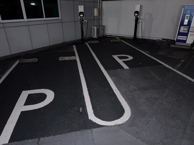 ホテル入り口に向かって左手に2機設置されてました。駐車スペースは3台分あり、ガソリン車が止まっていても1台は余裕があります。