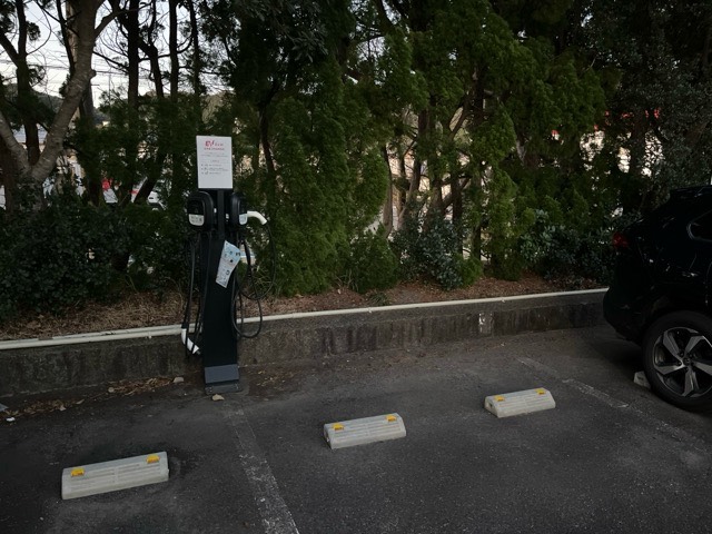 ホテル浦島の駐車場入り口を入って右に、しばらくすると右手に充電器が見えてきます。全部で4機設置されてました。