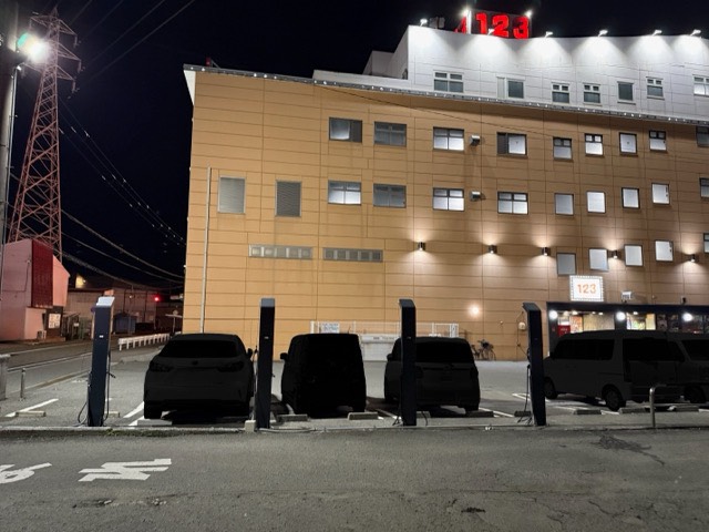 敷地の南側の平面駐車場の建物に近いエリアにあります。 訪れた時は2つの車室で充電はできそうでした。