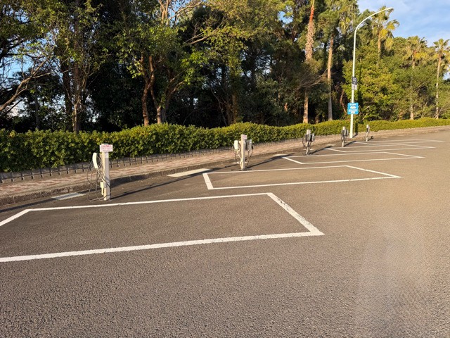 無料で問題なく使えました。 駐車場の脇の送迎車用エリアのあたりにありました。 5台分の車室があり、それぞれ国産車向けのみ1つ、国産車テスラ車共用3つ、テスラ向けのみ1つ、という風に並んでいました。
