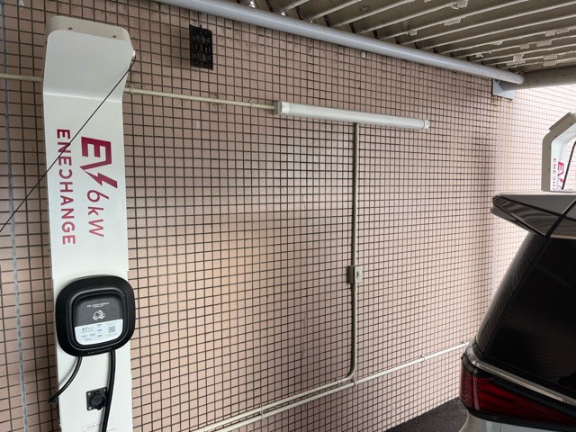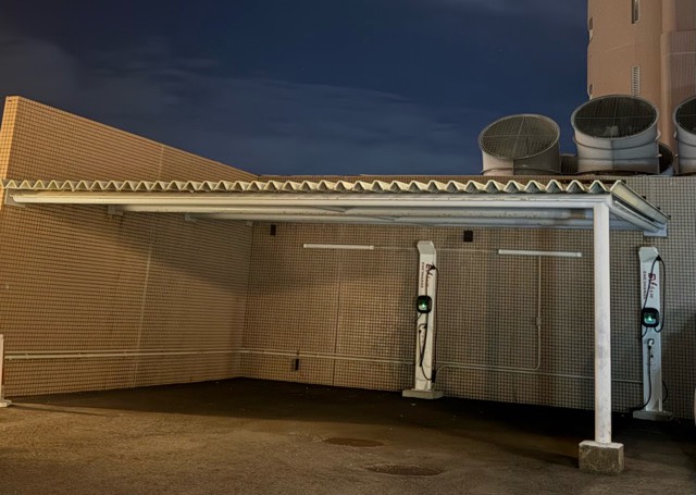 ホテル入り口に向かって左手に2機設置されてました。駐車スペースは3台分あり、ガソリン車が止まっていても1台は余裕があります。