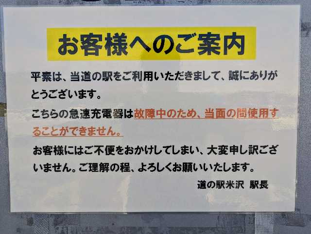 いつまで修理しない? 少なくとも電気自動車乗りには、寄りたく無い道の駅です。 いつまでに修理するとか新しい設備に更新するかを表示して欲しい