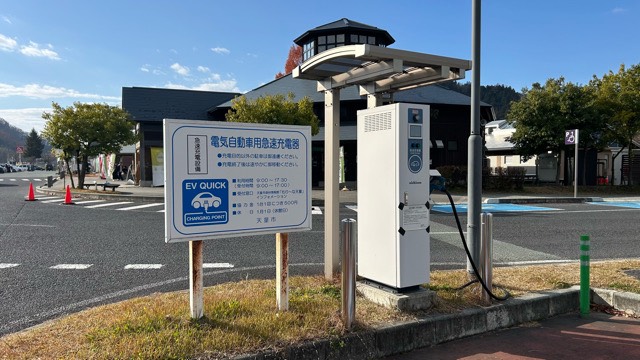 50kWタイプの充電器です。 屋根は有りますが狭いので注意が必要です。