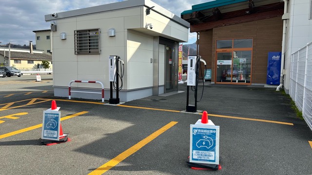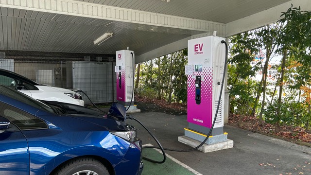 スロープ下に2つ50kw急速充電器があります。張り紙がしてありました。何度か遭遇してましたがphevの車が充電終了後もそのまま移動してないことが多いです。