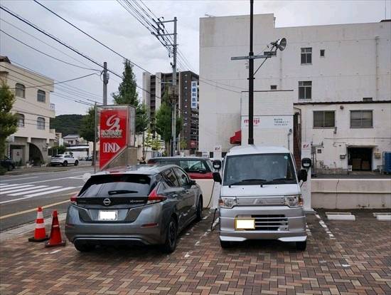 • EV用普通充電設備は、敷地東端の信号そばに設置されています。 下関三菱本社のEV用CHAdeMO充電設備からだと、そのまま北へ直進すると右側の駐車場入口から敷地に入り、ほぼ直進すると右側に見えてきます。 充電設備2台分に対してカラーコーンが2台分置いてありました。 訪れた10/22はパチンコ店は定休日でしたが、充電設備は利用出来ました。 充電開始後に少し歩いて昼食を食べている間に普通充電できたので有意義でした。