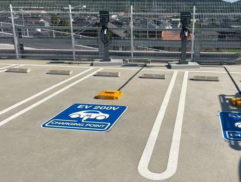 EV用普通充電設備は、店舗入口近くに設置されています。