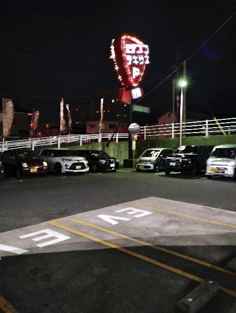EV用普通充電設備は、R188から下りスロープを下った左側に設置されています。 テキサスのサインポールを目印にしても見つけやすいと思います。 10/22夜に訪れた時はカラーコーンが置いていなかったものの、EVの大きな文字が良かったのか不明ですが、充電に関係ないエンジン車は駐車していませんでした。