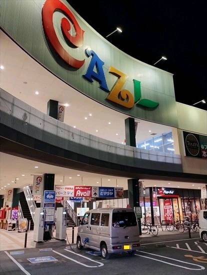 EV用CHAdeMO充電設備は、平面駐車場南東角に設置されています。 「CAZL」の大きなロゴを目印にすると辿り着きやすいと思います。 設置されているのは、最大125A放電するニチコン製です。 10/22夜にミニキャブMiEVバン10.5で充電を行ったところ、設備最大の125Aで充電が始まりました。