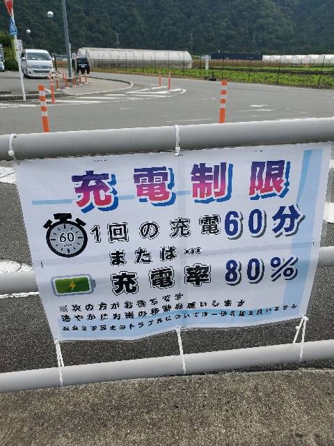 充電タイマー60分設定 充電代、駐車場代無料 中速なので充電スピードは高速に比べるとイマイチ、道の駅が営業時間外のときは暇です。 しかし無料なのでありがたいです。 付近にこどもが喜びそうなリニアの見学施設があります。