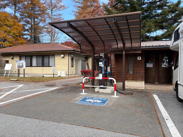 ニチコン製35kWです。山中湖湖畔のR138から敷地へ入り、駐車場右手トイレ前に設置されてます。