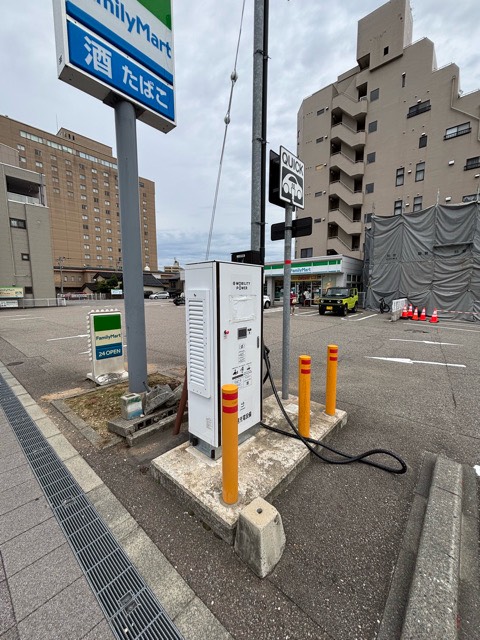 • ファミリーマートの駐車場に急速充電器があります。 1台のみて、E-MOBILITYpowerです。