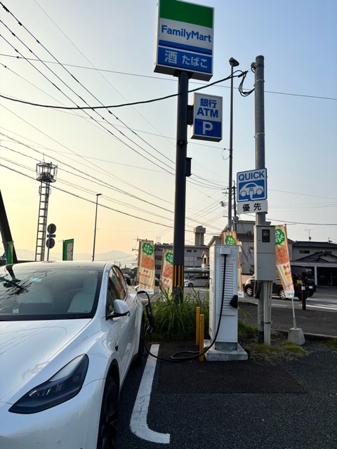 コンビニ駐車場内の、コンビニとは反対側にあります。EV優先という看板がありますが、専用駐車場ではなく、EV車以外が止まっていることがあるので注意が必要です。