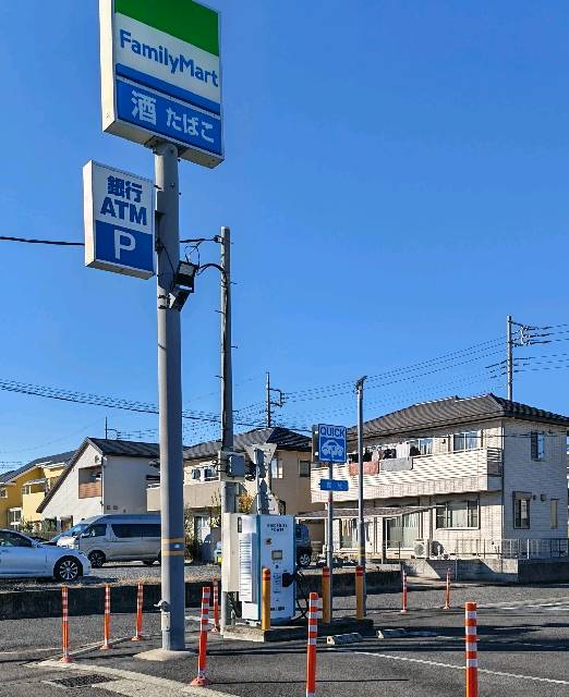 所沢方面のバイパス沿いのファミマに設置された 充電器です。 隣にはコープがありますので お昼休みとか買い物がある場合に利用しやすい場所です。