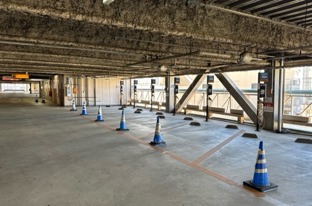 3F駐車場内(出口近く)にありますNEC製50kW充電器です。駐車場はゲート無しですがナンバー撮影され管理されていますので退場の際は必ず処理が必要です。