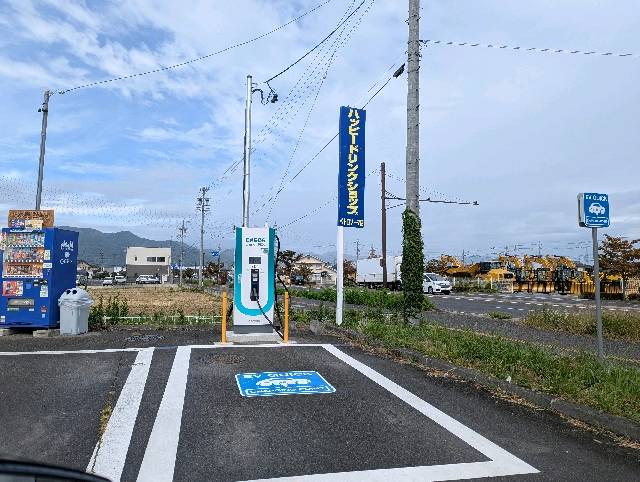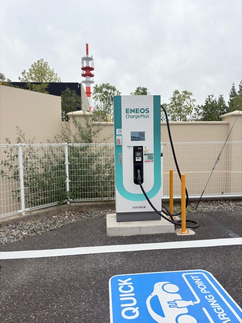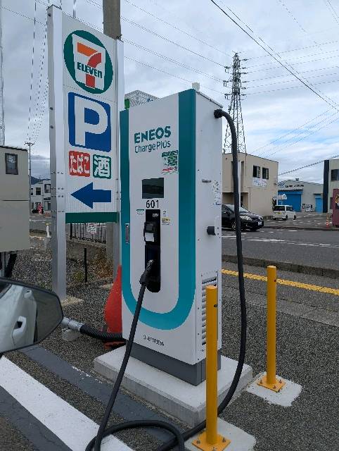 エネオス急速充電50kWhです 10分で13%から25%に回復! 走行可能距離90kmに [充電時間] 10分 [充電電力量] 7.395kWh [充電料金(税別)] 420円 [ご利用方法] EV充電アプリ [充電器種別] 急速 場所はお店の後ろで少し分かりにくいかもしれません