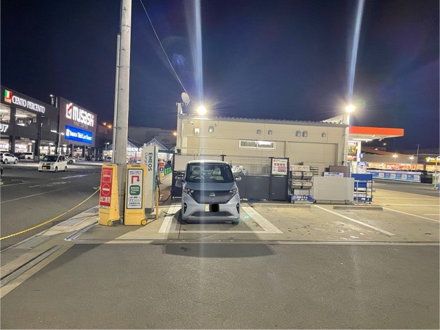 ガソリンスタンド右奥にあります。 充電スペースはそれほど広くないので停めにくかった。