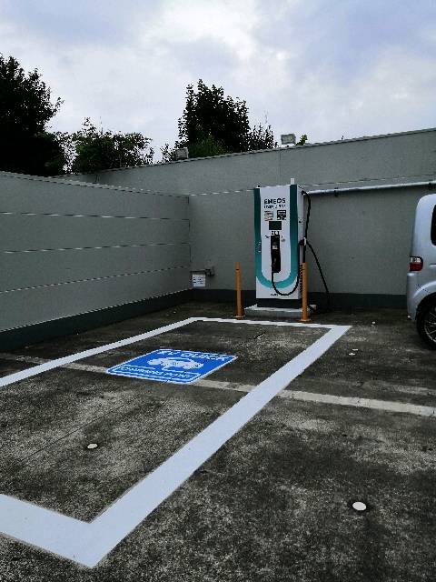 エネオスチャージプラスの50kW器。eMP連携カードでも利用可能。洗車拭き上げしながら充電が便利です。