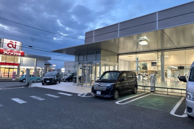 結構大きな店舗です。県道2号線側入り口入って左手に有ります。ガソリン車が停まっている場合ありですが、お店の方に言えばすぐに空けてくれます。店舗裏側にあるため、納車待ちの車等が充電駐車場前に並んでいて停めにくい場合有り。