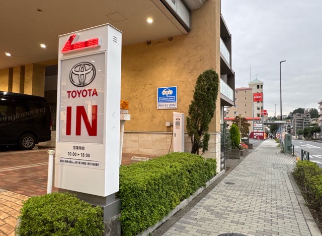• Y字交差点のTOYOTAの看板下にJFE製50kW機が1台設置されています。 ドライブスルー型なのでポート位置に合わせて入る必要があります。