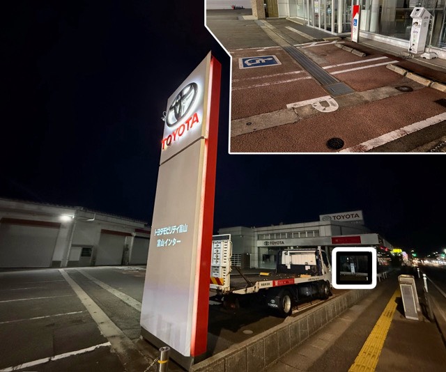 • 正面入り口から左に曲がって進むと、道路寄りにあります。写真追加 私の主観ですが、トヨタの充電器は「思いやり駐車場」にあることが多いイメージがあるのですが、ここは普通の車室で気兼ねなく使えそうです。