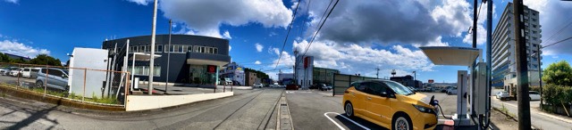 お隣も日産のディーラー。走行車線手前側のこちらの店舗で充電。黄色いバーにドアをぶつけないよう注意して下さい。