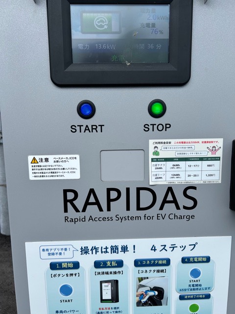 • 新しい50kWの充電器に更新されました。アプリ登録は不要で、クレカやQRコードで決済できるタイプです。