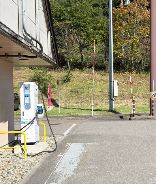 問題なく使えましたが、口コミ通り20kWhタイプなので遅いですね…。 付近には他にも数台ありますが、どれもこれも同じ20kWhタイプで、あまりこの周辺では充電には力を入れてないんでしょうね。 また、併設の温泉施設(温泉ですらなかったようですが)は、現在リニューアル工事中で立ち入り禁止になっています。 この施設が道の駅の施設も兼ねていたため、横に併設されているお食事処をのぞいて、トイレすら使えない場所になってしまいました。 唯一例外で充電器のみ24時間開放されているようです。