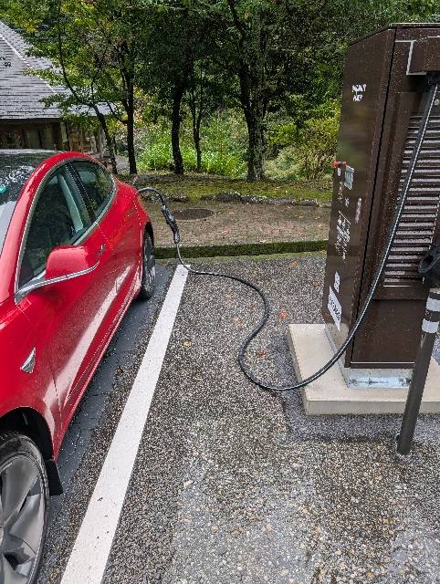 テスラ・モデル3充電できました。 バッテリー容量約58%で43kW出てました。けれど64%辺りになると34kWと微妙な速度に・・・ 認証は、ゲスト充電用のQRコードを読み込みました。Webサイト上で必要情報を入力し、充電を開始します。認証カードも使える様です。料金は、最初の5分275円。その後55円/分でした。 充電ステーションは、道の駅に入って右奥の駐車場の突き当たりにあります。充電ステーションの前にEVマーク付きのかなり広い充電エリアがあり、駐車しやすいです。近所に無料の中速充電スタンドがありますが、遅いので、急ぎの場合はコチラで充電した方が良いかと思います。