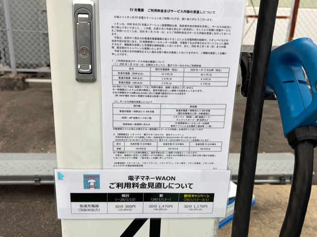 この施設はシステムの都合上、(1)と(2)に分かれて登録されています。 -------------------- 設置場所:屋上駐車場(イオン寄り) 充電6時間までの範囲で選択可。 ENEOS Charge Plus会員の場合、最大出力6kW