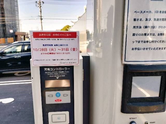 2025年10月23日付 2025年10月28〜31日にかけて、急速充電器交換に伴う利用休止となる旨のお知らせが貼ってありました