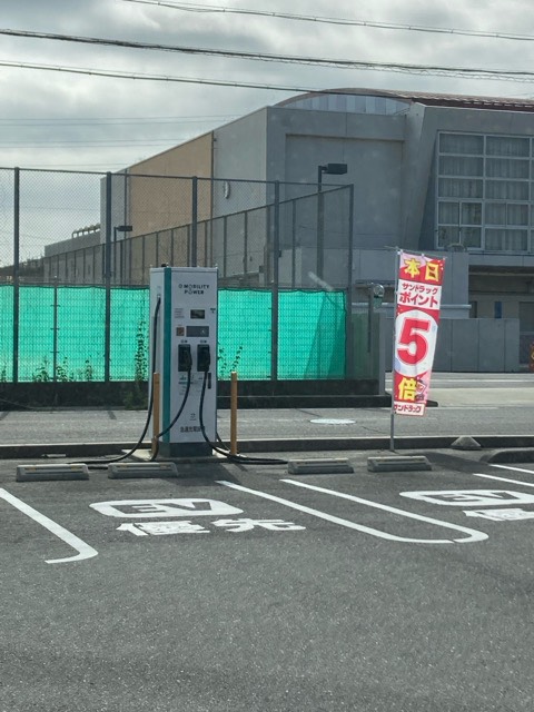 サンドラッグの駐車場にあります。 EV優先と書いてあります。