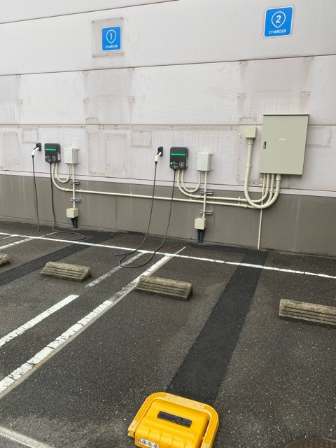 日進のニトリ駐車場入って少し奥の建物に普通充電器が2台並んで設置してあります。 MYプラゴで6kwタイプです。