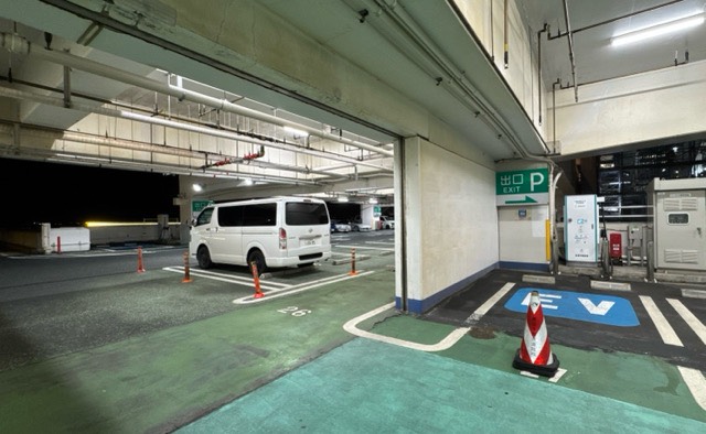祝祭日24時間設置場所:3階駐車場の最終部 入口から入って進行方向に進んでいただくと、曲がり角ごとに誘導看板がありますので矢印の示す方向に進んでください。出口の反対方向に充電器があります。駐車スペース内を1周回っていただければたどりつけます。