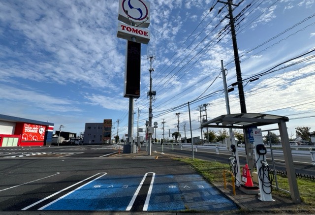 敷地内道路側に東光高岳製50kW機が1台設置されています。 中央分離帯があるので反対車線からのアクセスには転回が必要です。
