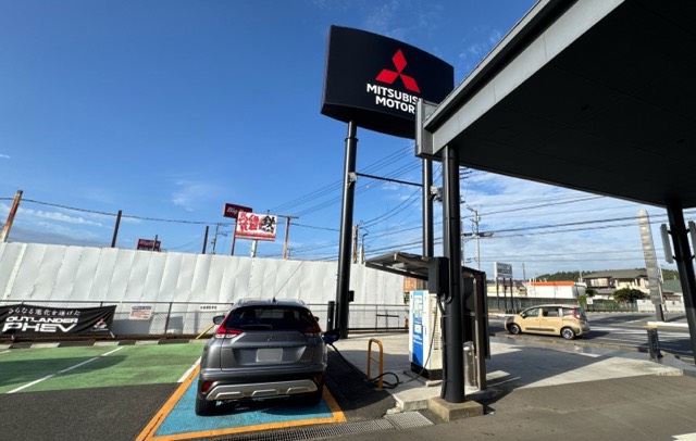 (株)東光高岳製50kW器です。販社敷地入りすぐ左手の屋根下に設置されてます。悪天候でも濡れずに充電可能です。
