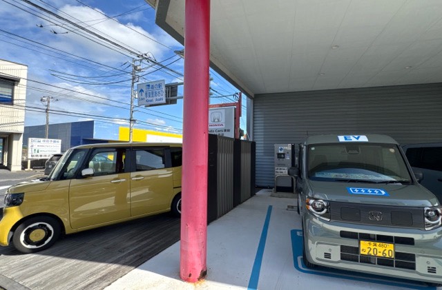 JFEテクノス製50kW器です。販社敷地に入りすぐ左手、屋根下展示車枠に設置されてます。