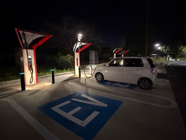SAに入ってすぐの、わかりやすい場所にあります。混雑時には駐車誘導員に一般の駐車場へ案内されそうになることがあるため、充電を希望する場合はその旨を伝えるとよいでしょう。 4台設置されたマルチタイプの充電器は、待ち時間もなくスムーズに利用できました。このような路線にもマルチ充電器の整備が進んでおり、以前よりも使いやすくなってきたと感じます。