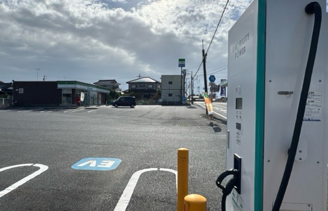 駐車場内道路側の目立つ場所にnichicon製50kW機が1台設置されています。 ファミマ駐車場内ですが歩いて行ける所にセブンイレブンもあります。