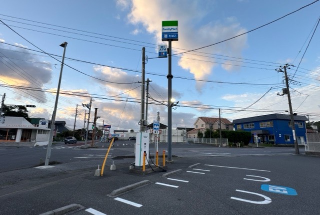 設置場所:県道274号線沿いの入り口より敷地内へ入り、道なりに進むと右側に建物があります。道路挟んで向かいの左側にある駐車エリア、道路沿いの車室にEV充電器があります。 どなたでもご利用いただけます。 最大出力6kW