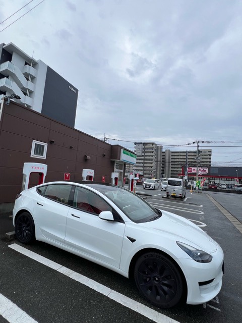 Tesla スーパーチャージャーです。 ファミリーマート併設で、4基あります。
