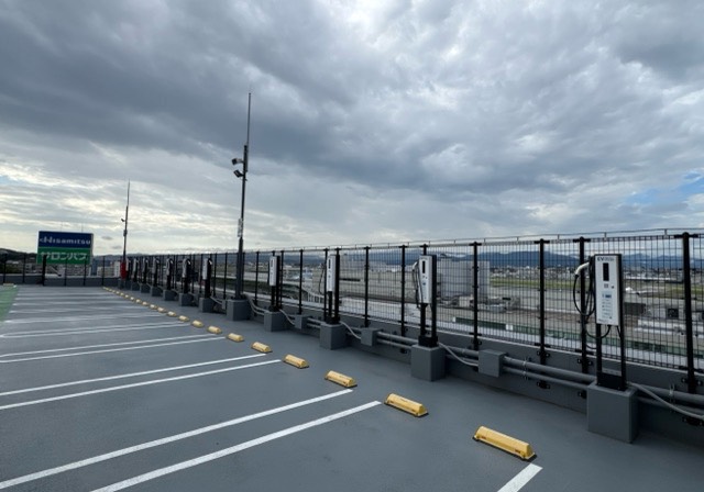 TerraCharge認証日東工業(株)製6kW×11器です。立体駐車場9階エレベーターホール近く、空港側に設置されてます。日曜朝でしたが、充電してる車両はいませんでした。