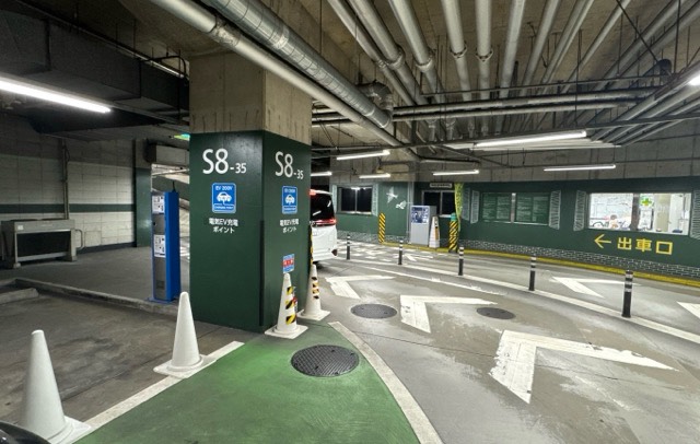 Panasonic製200Vコンセントです。充電にはコネクター持参が必要です。S8-35柱隣、事務所前出口隣の駐車枠に設置されてます。駐車枠は狭いです。