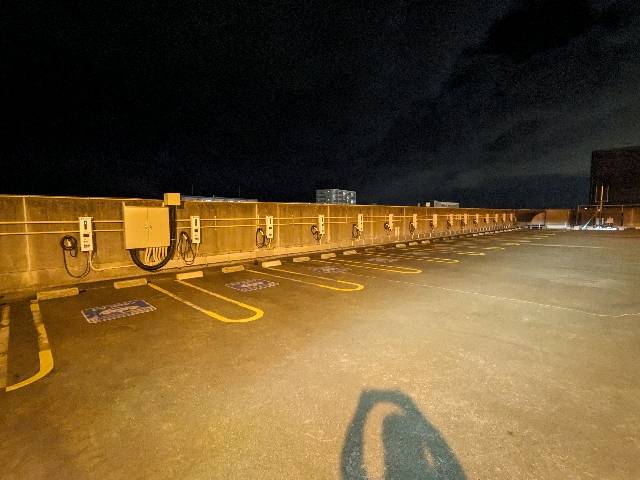 午前6時から開いている立体駐車場から屋上へ上がると、充電器にたどり着け、朝6時台でも使うことができました。