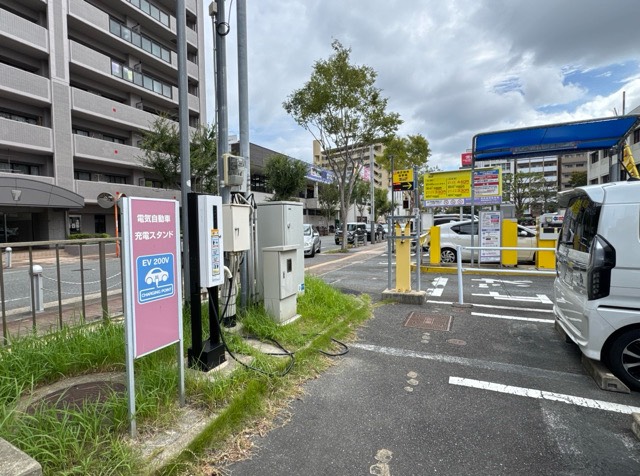 タイムズクラブ会員でパークアンドチャージ会員登録すれば充電料金無料 駐車料金平日18時から翌朝8時まで330円で土日祝は440円で打ち切りなので普通充電するならここはお得 マックスバリューが24時間営業で歩いて直ぐ、JR姪浜駅も直ぐ近くなので正しくパークアンドライドが可能な場所